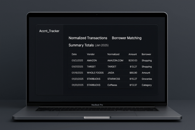 using a dynamic config-driven rules system. It normalizes messy transaction names, detects borrower payments